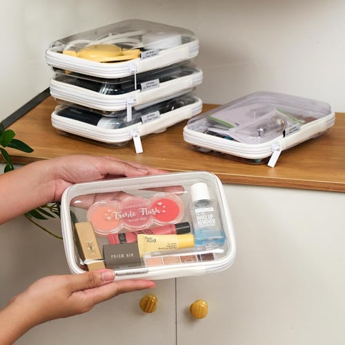 Perfect for organizing those smaller essentials around your home or packing for travel, these clear zipper pouches are just so handy. They’re flat, stackable, and TSA-approved, which means you can bring them with you on long-haul flights. Use them in diaper bags, suitcases, and everyday backpacks, alike.
