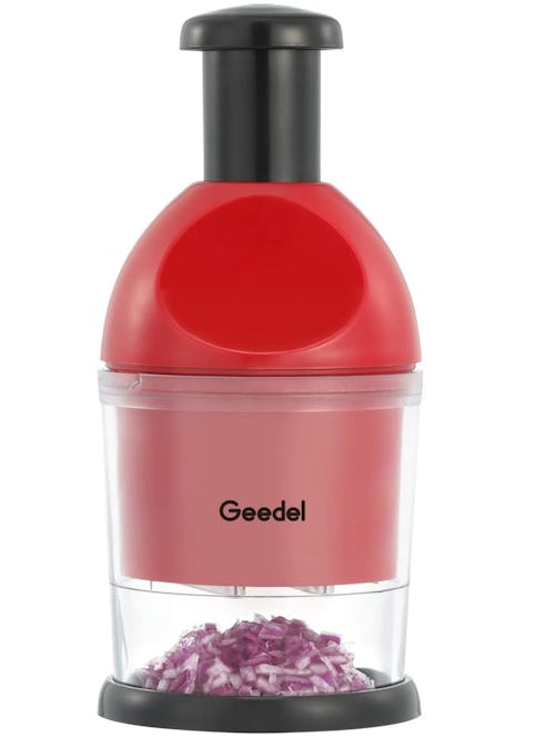 Garlic, onions, tomatoes, almonds — the stainless steel blades on this food chopper can power through all of it and more. The blades are encased in a protective shield to help keep your hands safe, and it only takes a few pumps on the handle to get your ingredients evenly chopped.