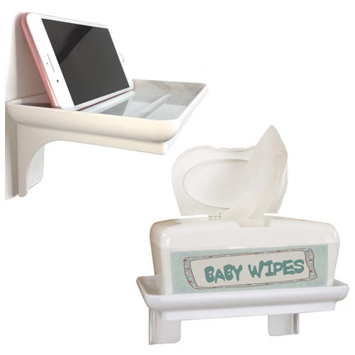 Need a place to set your phone, a speaker, or some other small item that you need to keep handy? This little shelf will stick anywhere and do the trick. It has little ridges so your phone will stand up, and it's easy to install: just peel and stick. The unit comes in lots of great finishes to match your home, and each one can hold up to 5 pounds.