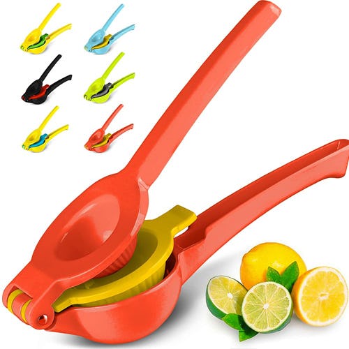 Don't let the bright colors of this lemon-and-lime squeezer fool you into thinking it's plastic. This is a solid metal tool that does a great job at making citrus juice within seconds. Put one half of a lemon or lime in the center compartment, and then squeeze. It'll hold onto the seeds and puts the juice exactly where you want it — whether that's a glass of water or a piece of salmon.