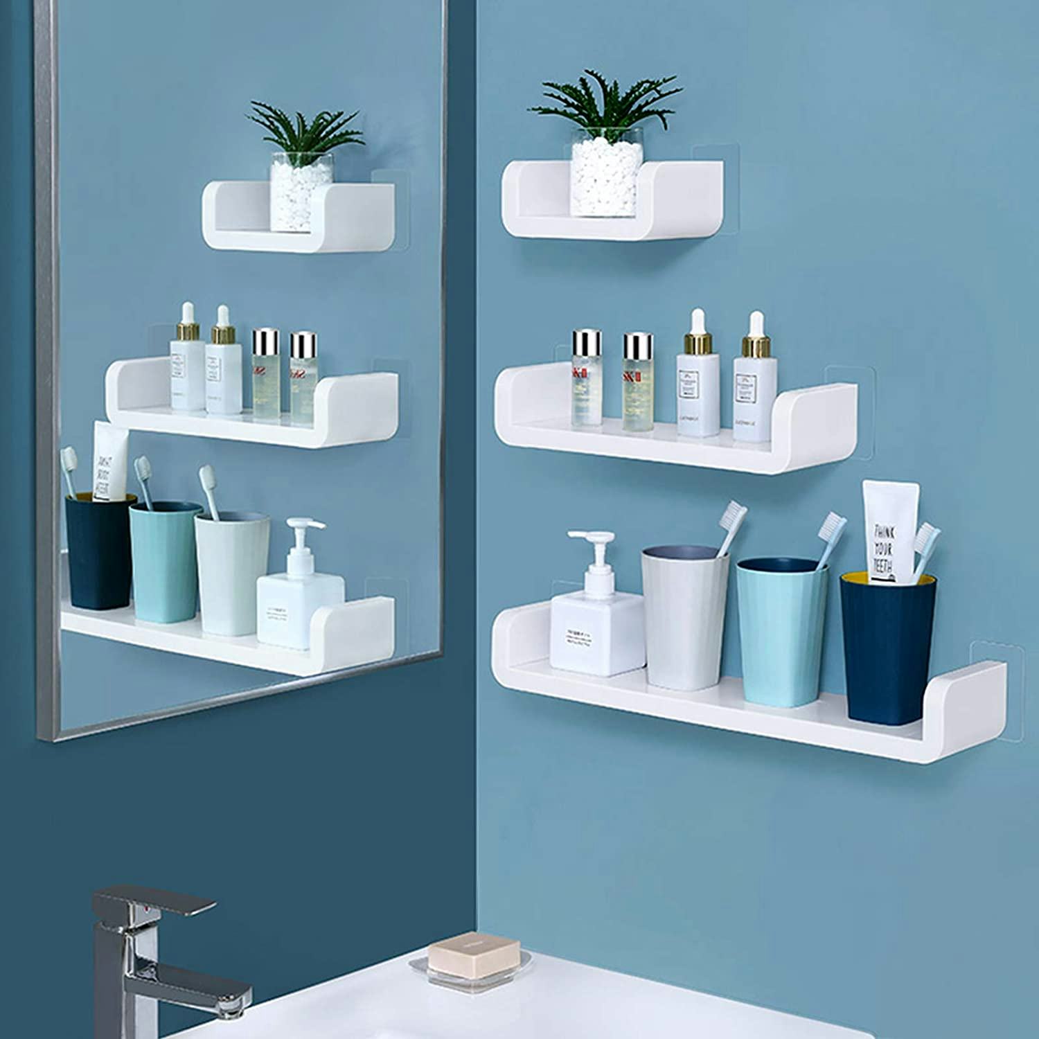 Instead of cluttering up a small vanity with your personal care items, use the wall space as storage by sticking these small and adhesive mounted shelves to the tile or mirror. Your lotions and toothbrushes will be easy to access, and it will free up space on the sink. They work well in the kitchen, too.
