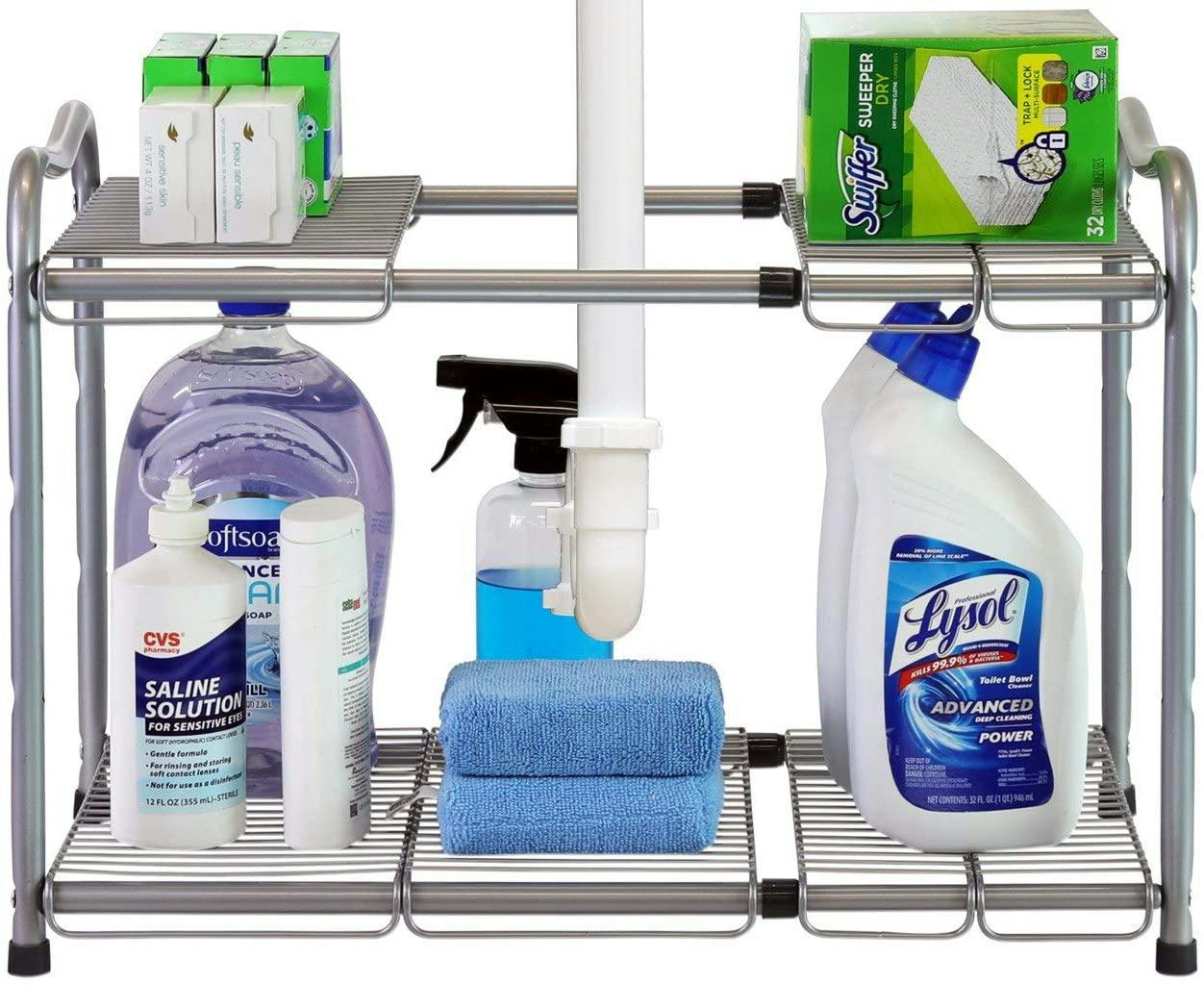 Look under the kitchen and bathroom sinks. There’s a lot of space under there, but the awkward shape can make it difficult to maximize. These shelves allow you to reclaim that space and keep it organized. They accommodate the plumbing, lift supplies up off the cabinet floor, and add another shelf to take advantage of the vertical space.