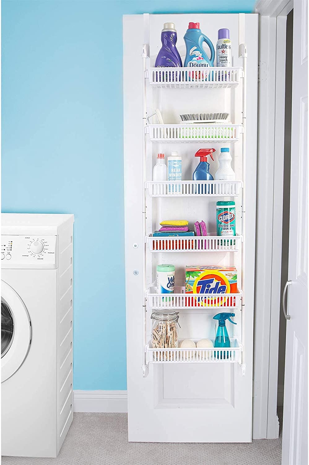 Create a pantry on the back of the kitchen door or a laundry storage room on a closet door with this over-the-door storage system. It hangs over the top of the door, screws into the bottom for stability, and brings six wide baskets for easy storage right where you need it without eating up any floor space.