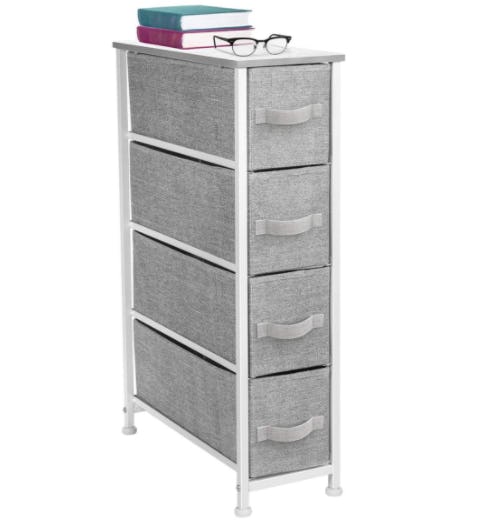 This cute little dresser with four simple fabric drawers makes a terrific, organized bedside table, sneaks into a corner of the closet for socks or underwear, hides under your desk for keeping office supplies sorted, or whatever you need. The top is wood and the drawers come in 12 color options that range from serious to playful and will fit lots of rooms and ideas.