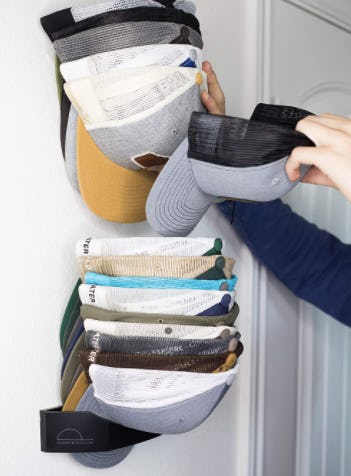 If you have a massive cap collection, you need a good storage system or they will be everywhere; this weird system is simple and effective. Mount the strangely shaped brim holder to the wall and insert a brim into it. Then stack the rest of your hats on top of that one. You can nest lots of caps this way and each one is easy to grab just by lifting the ones above it.