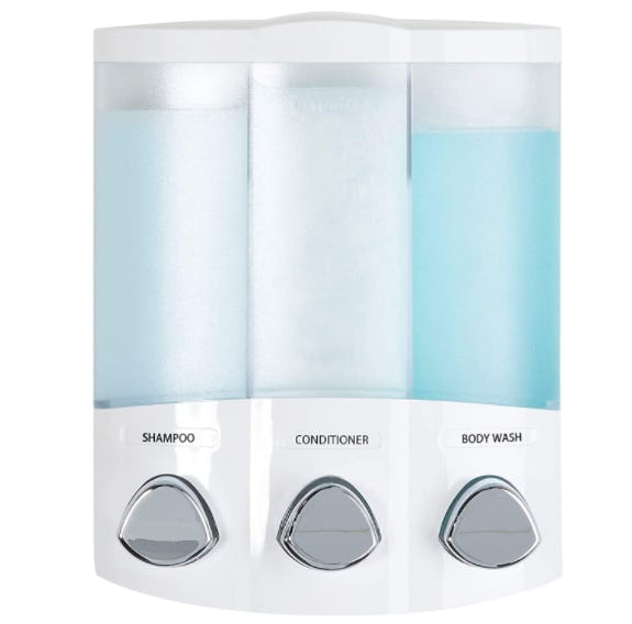 This shampoo and conditioner dispenser mounts onto your shower wall for easy access. It installs without tools and comes with its own waterproof silicone adhesive and double-sided tape. This triple chamber dispenser can be used to hold body wash, hand soap, or lotion.