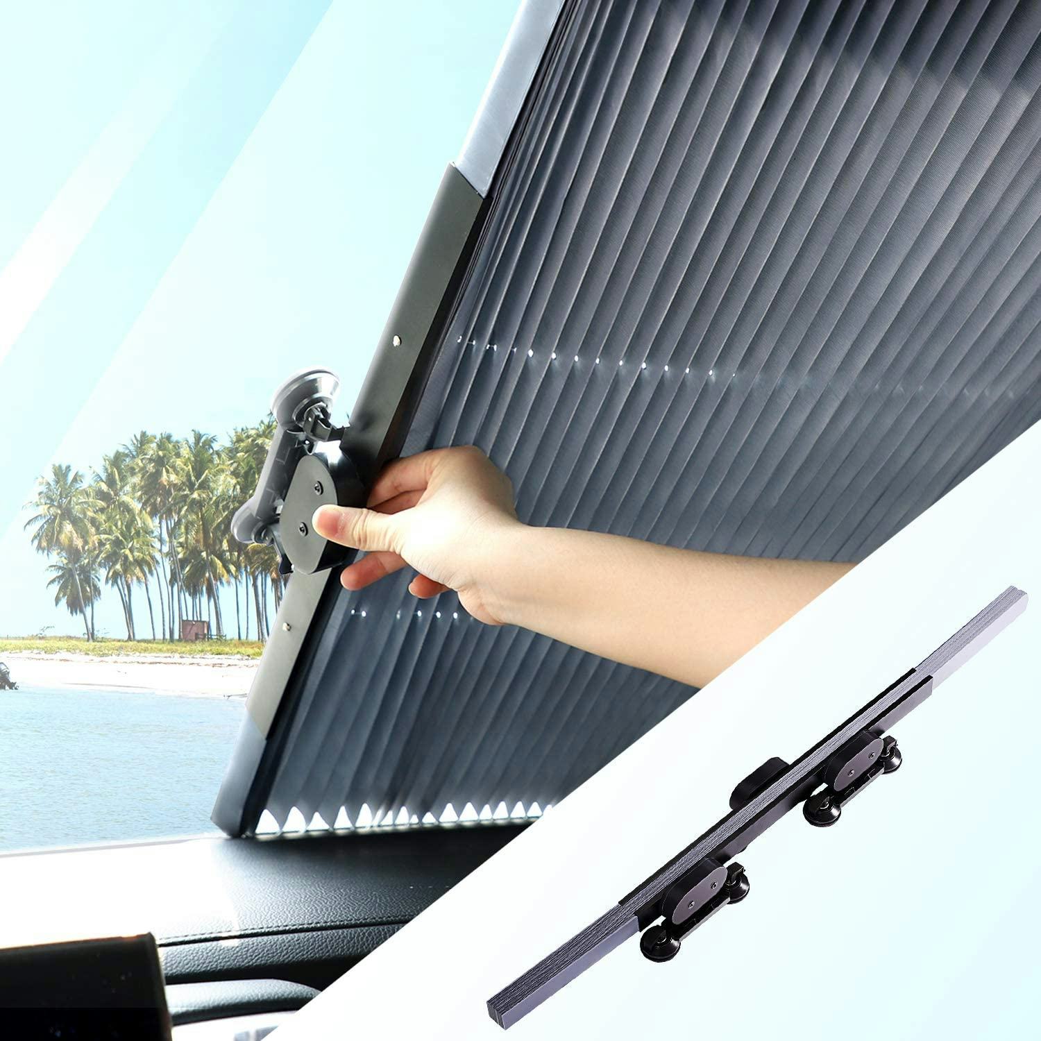 This insulated car sunshade keeps your car much cooler when it's parked on hot days. Unlike some other shades, this one has strong suction cups that keep the shade firmly in place. And the shade has a universal fit that expands or shrinks to fit both cars and trucks.