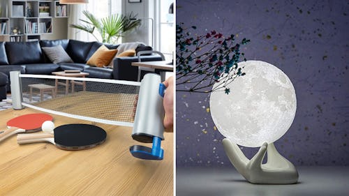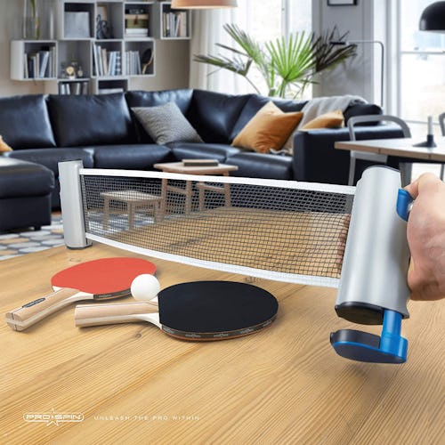 No space for a ping pong table? Get this portable table tennis set instead. It comes with everything you need for a competitive tournament with your arch-rival (read: your roommate), including two paddles, a net you can set up on your kitchen table, three ping pong balls, and a storage bag for all of it.