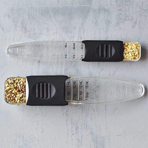 Instead of dirtying up a ton of different cups and spoons, these adjustable measuring spoons are the only tools you'll need to make a meal. One spoon measures out tablespoons and the other measures teaspoons, and each has a small slider that you can move up or down, depending on how much of an ingredient you want to add to your dish. On top of that, these spoons are made from durable, food-grade plastic that will hold up to wear and tear over time.