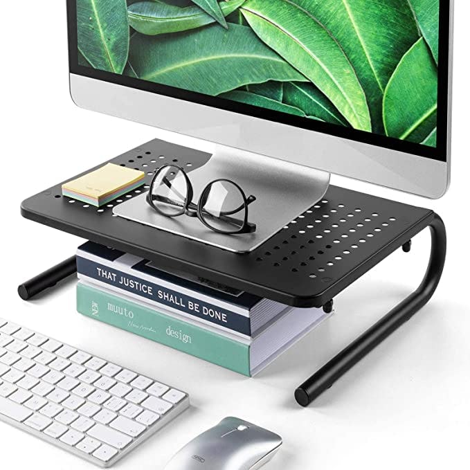 Create more space on your desk and work comfortably with this monitor stand riser. The 14.5-inch screen riser is a metal stand that adjusts your monitor to a higher, more comfortable viewing position. It has perforated holes to allow for airflow and leaves just enough room beneath it to store books and other items. The stand has non-slip padding to keep it in place and protect furniture.