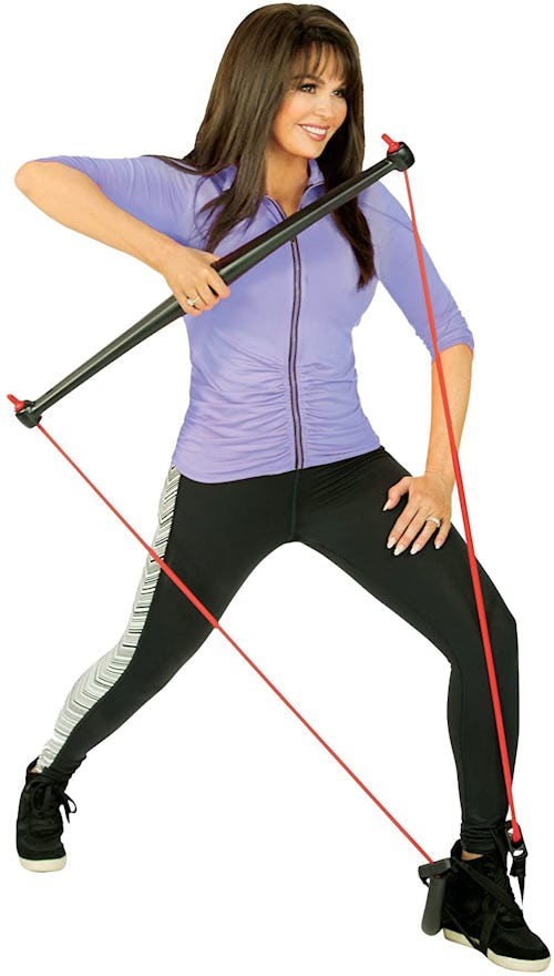 Make the most of limited at-home workout space with this portable gym kit. Compact and lightweight, the all-in-one kit includes a bar and a resistance band, which together allow you to perform upwards of 18 strength-building exercises, like bicep curls, core twists, shoulder presses, squats, and lunges. The kit stores compactly in a pouch, so you can stash it out of the way when you're done.