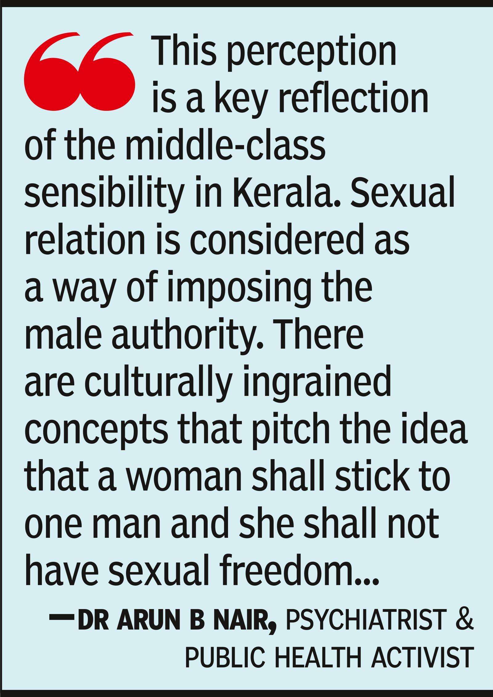 Public health specialists say that this kind of perception among men in Kerala is hardly surprising. “This perception is a key reflection of the middle-class sensibility in Kerala. Sexual relation is considered as a way of imposing the male authority. There are culturally ingrained concepts that pitch the idea that a woman shall stick to one man and she shall not have sexual freedom. There are a lot of preconceived notions regarding the use of contraception by women. The younger generation we come across during pre-marital counselling has a more liberal outlook towards sexuality after marriage. They insist on sexual freedom post marriage because for them it is more like entertainment and does not imply any emotional relationship,” says Dr Arun B Nair, noted psychiatrist and public health activist.