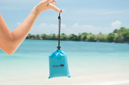 A waterproof beach blanket that folds up into a tiny pouch
