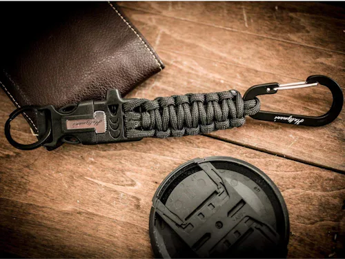 A carabiner keychain with five built-in survival tools