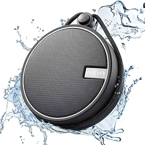 A rechargeable, waterproof speaker with a suction cup & carabiner clip
