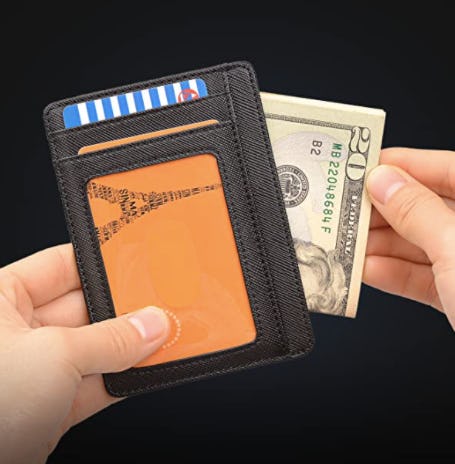 Made from 100% leather and available in more than two dozen colors, this minimalist wallet has an upscale feel and a budget-friendly price. It features eight credit card slots plus a hidden pocket for cash, and the RFID technology shields your ID and credit cards from any potential digital theft.