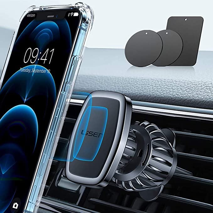 Use your smartphone as a hands-free device with this car phone mount. It’s designed to clip securely into your car’s air vents, and it has a magnetic mounting surface that keeps your phone stable and secure. It has near-universal smartphone compatibility and comes with two metal pads that will help you attach your phone to the magnetic surface.