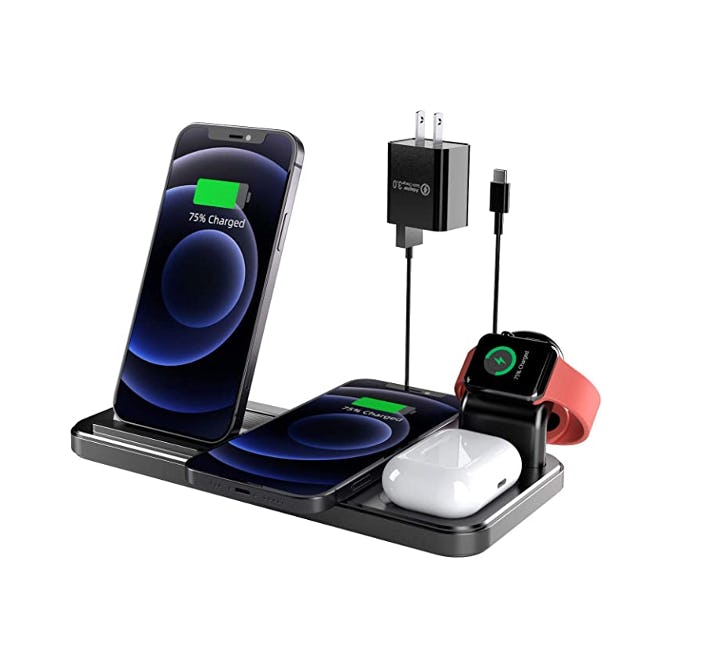 This wireless charging station can power up as many as four devices at once, which is seriously impressive for only $20. You can charge two smartphones, earbuds, and a smartwatch on this space-saving dock, which is compatible with both Apple and Samsung products. Note that the watch charging station is not wireless, but it is designed to hide the wire.