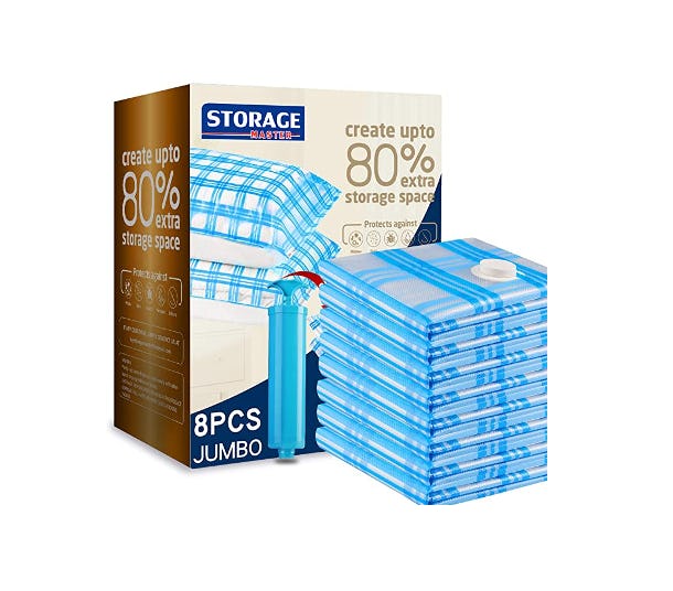 Perfect for storing out of season clothing or linens, these vacuum storage bags can give you an additional 80 percent of storage space if used at their fullest capacity. They come in a pack of eight, and each bag can hold a full queen-sized bedding set. It also comes with a hand pump that’s ideal for travel.