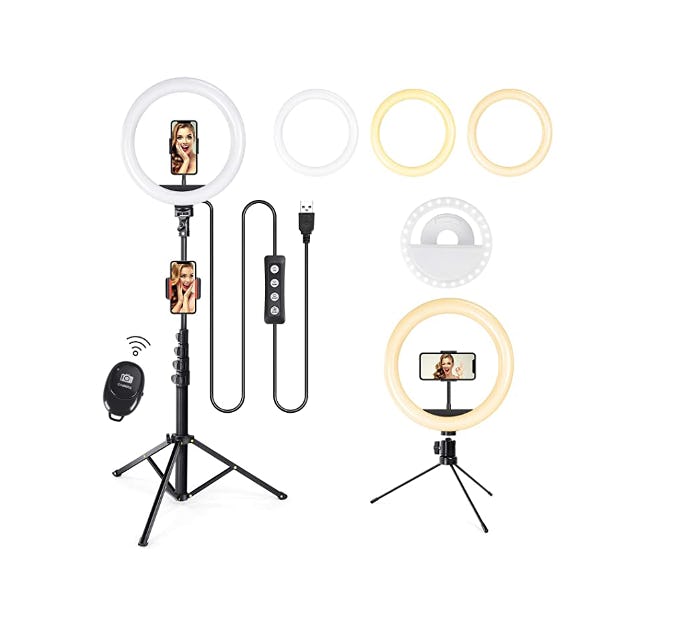 This cheap ring light comes with all the added features you’d want. The ring light has three light modes and multiple brightness settings, and it comes with a remote trigger, and an adjustable tripod with an integrated cell phone holder that works in both portrait and landscape modes, which makes it ideal for vloggers.