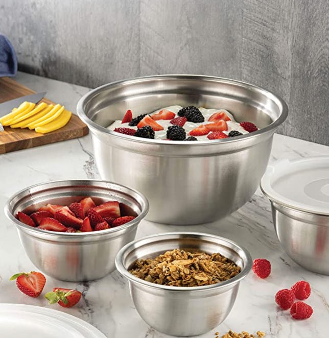 This set of stainless steel bowls will solve so many problems in your kitchen. They range in size from a small 3/4-quart bowl all the way up to a big five-quart bowl, and each one has a matching lid so you can use them for mixing and for storage. The flat bottoms make them easy to work with and they — including the lids — nest into each other so they store in one compact spot.