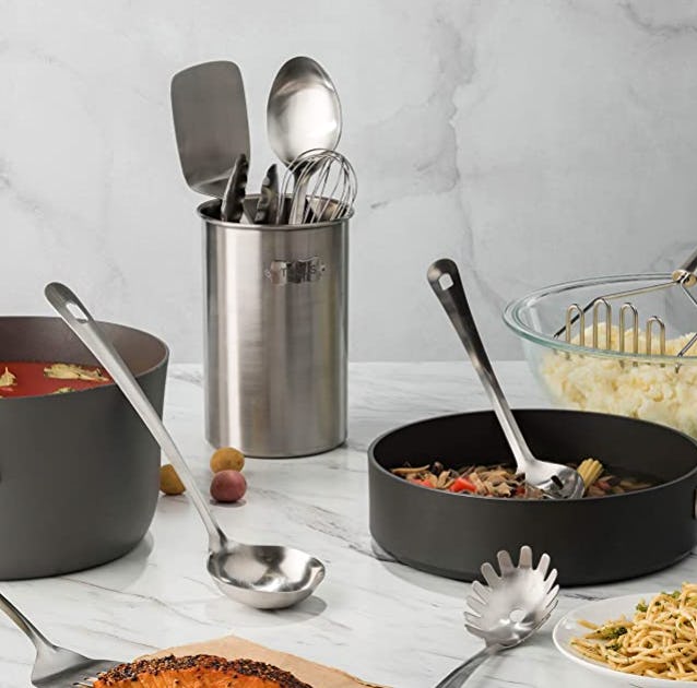 This set of kitchen tools is everything you need to start off a kitchen. There are nine utensils — spoons, turners, tongs, a ladle, a whisk, a big potato masher, and more — that fit into the included stainless steel utensil holder. And they are all stainless steel to match the utensil holder. They also have loops so you can hang them if desired.