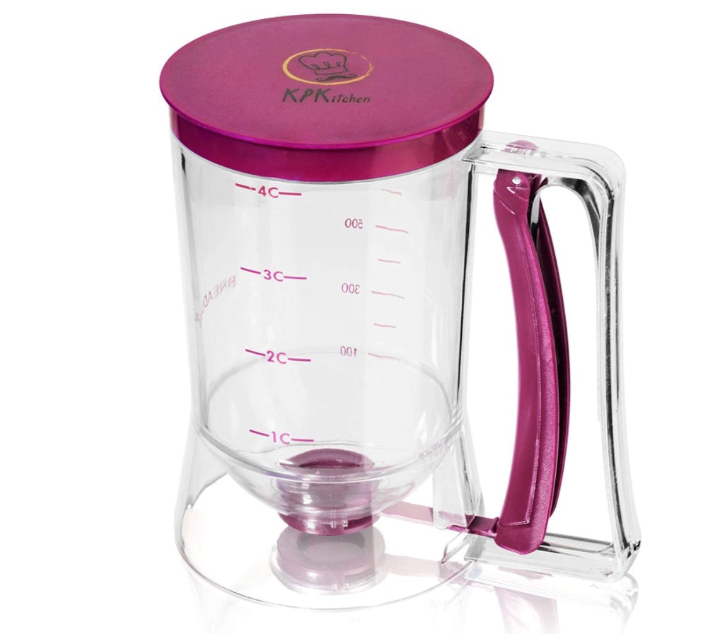 Mix your pancake batter in this measuring pitcher and let gravity do the work. Since there's a spout at the bottom (and a handle that controls it), the batter will pour out when you squeeze so you can move quickly across the griddle instead of trying to pour from a bowl. It makes creating evenly sized pancakes so much easier, and it's even effective with thinner crepe batters.