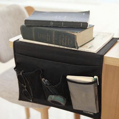 I'll bet if someone surveyed modern relationships on mundane irritants, remote control storage would emerge as one of the top friction points. When remotes get lost, it's frustrating, and people get blamed. And when remotes are always cluttering up the coffee table, it's just as bad. They need a place — and that place has to be easy to use. This organizer hangs off a side table or armrest and stores them within reach. It's also a great place to put glasses, pens, or other sundries. In fact, you might want one on the couch, desk, and bed to store all the small items that turn to clutter.