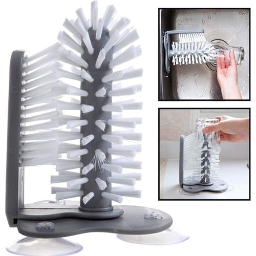 Ever sat at a bar and been impressed by how many glasses the bartender can easily wash while chatting? That's because there's probably a brush like this one attached to the bottom of the sink. If you want to try it, all you have to do is put the glass over the brush and rotate. Everything — even lipstick — should come right off. This one has suction cups that stick to the sink and a side brush to get the outside of the glass clean. It works for water bottles, mugs, and whatever else you drink from.