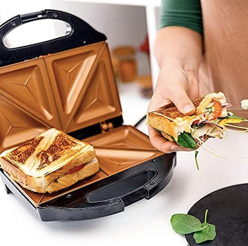 Fans of paninis, tuna melts, and BLTs: This sandwich press toasts your bread and heats your fillings in less than five minutes, and even seals the sandwich for easy slicing. The nonstick copper plates don't require butter or oil, and they can be simply wiped clean with a damp cloth after lunch.