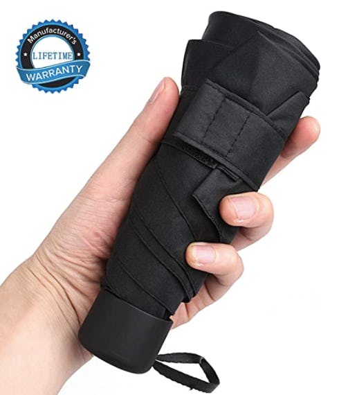 No matter where your travels take you, you can be prepared for unexpected rainstorms with this mini umbrella. Sized for suitcases and car glove compartments, the lightweight umbrella pops out to a full-size canopy and features sturdy fiberglass ribs that can withstand wind and heavy rain. It comes in colors like black, navy, and bright orange.