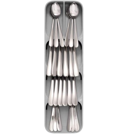 Instantly free up kitchen drawer space with this skinny cutlery organizer. The front ends of the individual compartments nest on top of each other to make use of vertical storage, while the open ends make it easy to grab the utensils you need.