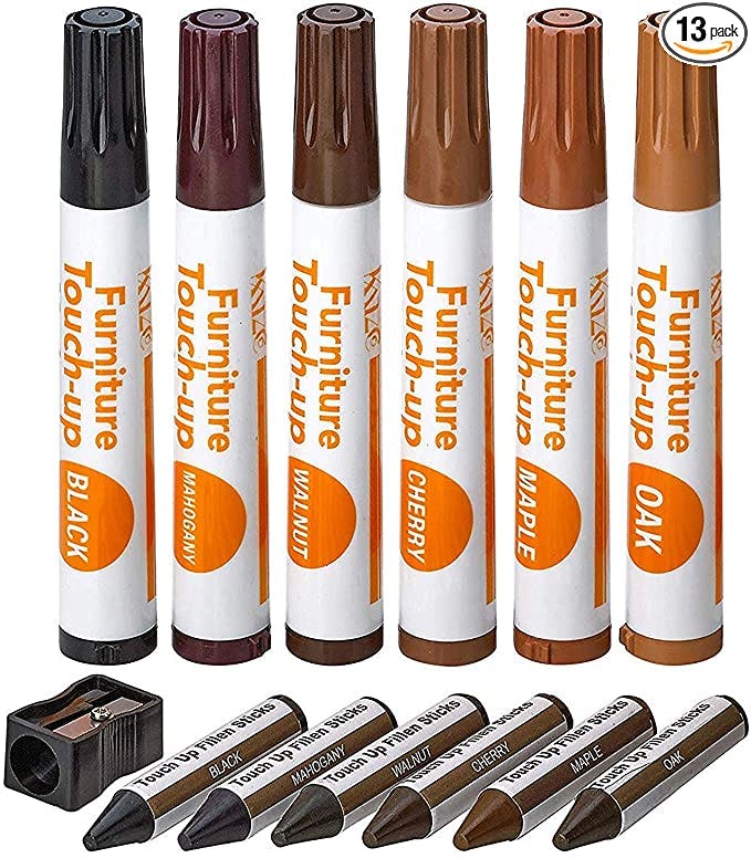 Touch up your furniture with this wood repair kit, which includes with six wood markers, six wax sticks, and a sharpener. It comes with maple, oak, cherry, walnut, mahogany, and black colors, so you can easily match it to your furniture. These markers and wax sticks are also permanent, so they're perfect for covering up scratches, scuffs, and stains for a long time.