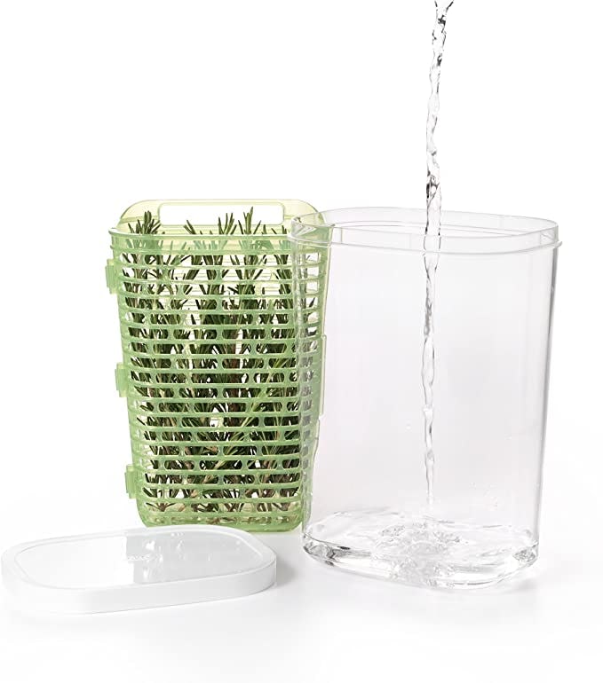 Tired of buying fresh herbs only for them to go bad after a few days in the fridge? Try out this large herb saver, which preserves your herbs so they stay fresh longer. Simply pull out and open the interior basket, put your herbs in it, fill the container with water, then put the basket back inside to keep your herbs from wilting.