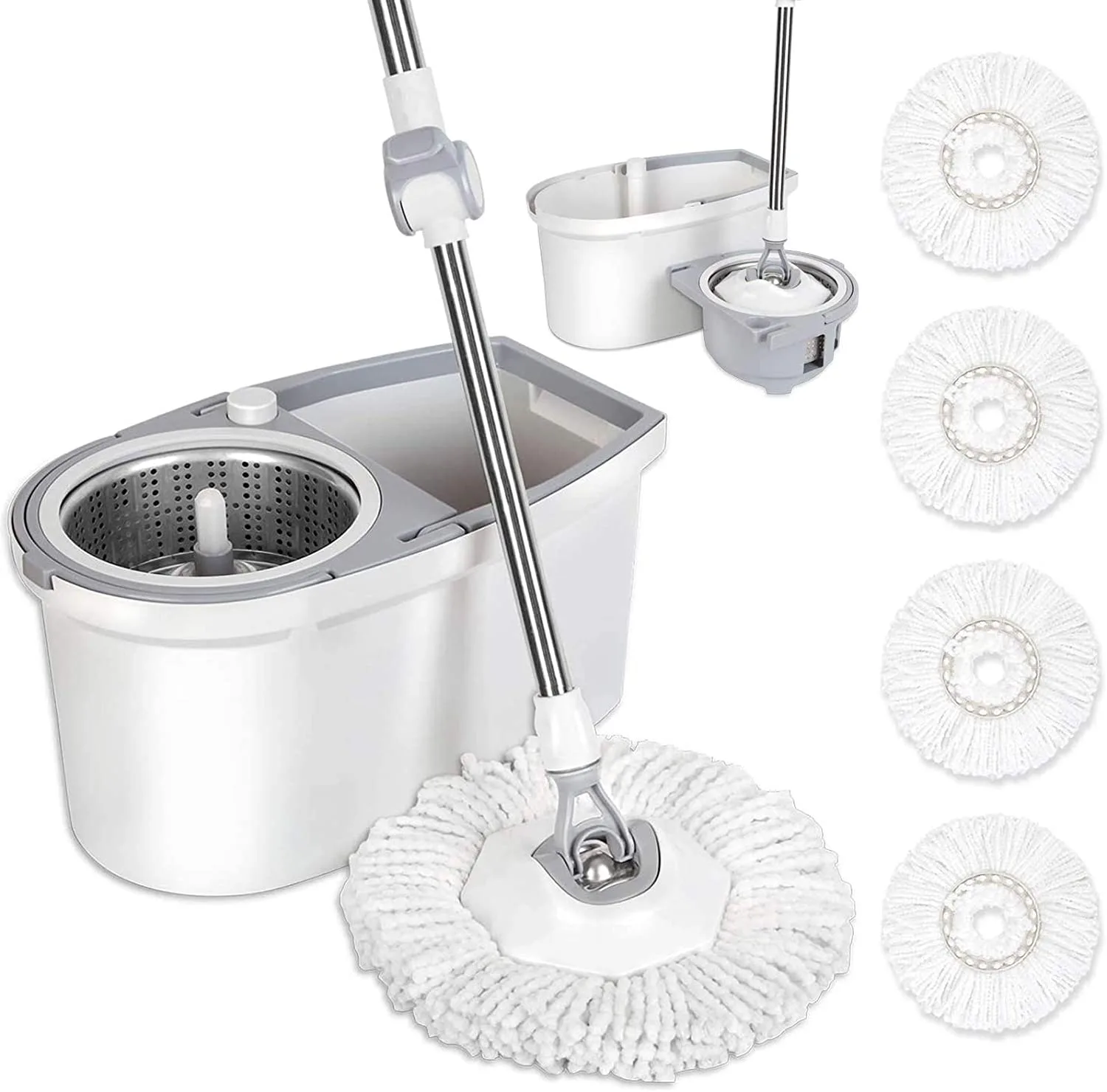 Bring your cleaning method up to date with this modern mop and bucket set. The mop holds tons of water and is shaped to reach into crevices and corners. A hinge where the handle meets the head lets you get the mop flat to go under furniture and appliances, and the hydraulic handle spins to efficiently empty the mop head into the bucket, which can be easily drained.