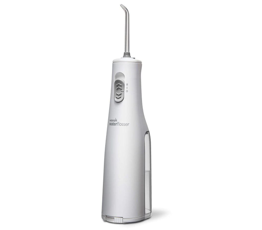 This handy, battery-operated water flosser is compact and simple to use. Fill the base with water, press the button, and blast away trapped particles between your teeth while massaging your gums. It has two pressure settings and comes with two flossing tips. It's great if you want a more thorough cleaning after flossing or if you "just can't" when it comes to dental floss.