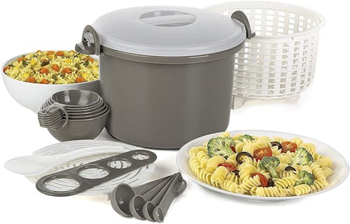 If you have a small kitchen, this microwavable rice cooker makes preparing meals even easier. It can steam rice and pasta in mere minutes and comes with a lockable lid, rice paddle, measuring cups, and other accessories to help you cook without turning on the stove.