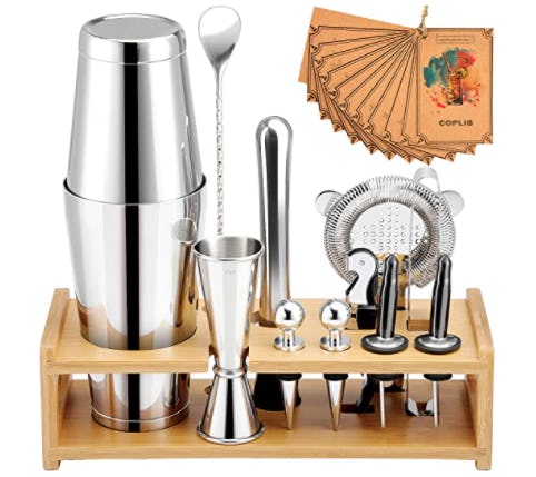 Flex your bartending skills at home with this cocktail shaker set. It's made with durable stainless steel and includes everything you need to make pro-level drinks from the comfort of your home. One reviewer reported, "This is absolutely perfect for an amateur trying to make cocktails, it makes me feel like a professional!" Plus, it comes with recipe cards and a sleek wooden shelf to display your tools.