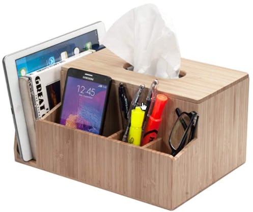 This bamboo organizer box can be used just about anywhere: on your desk for supplies, on your nightstand for bedtime essentials, or in your bathroom for toiletries. Along with three compartments and a slot for books and tablets, it has space for a large box of tissues under the lid.
