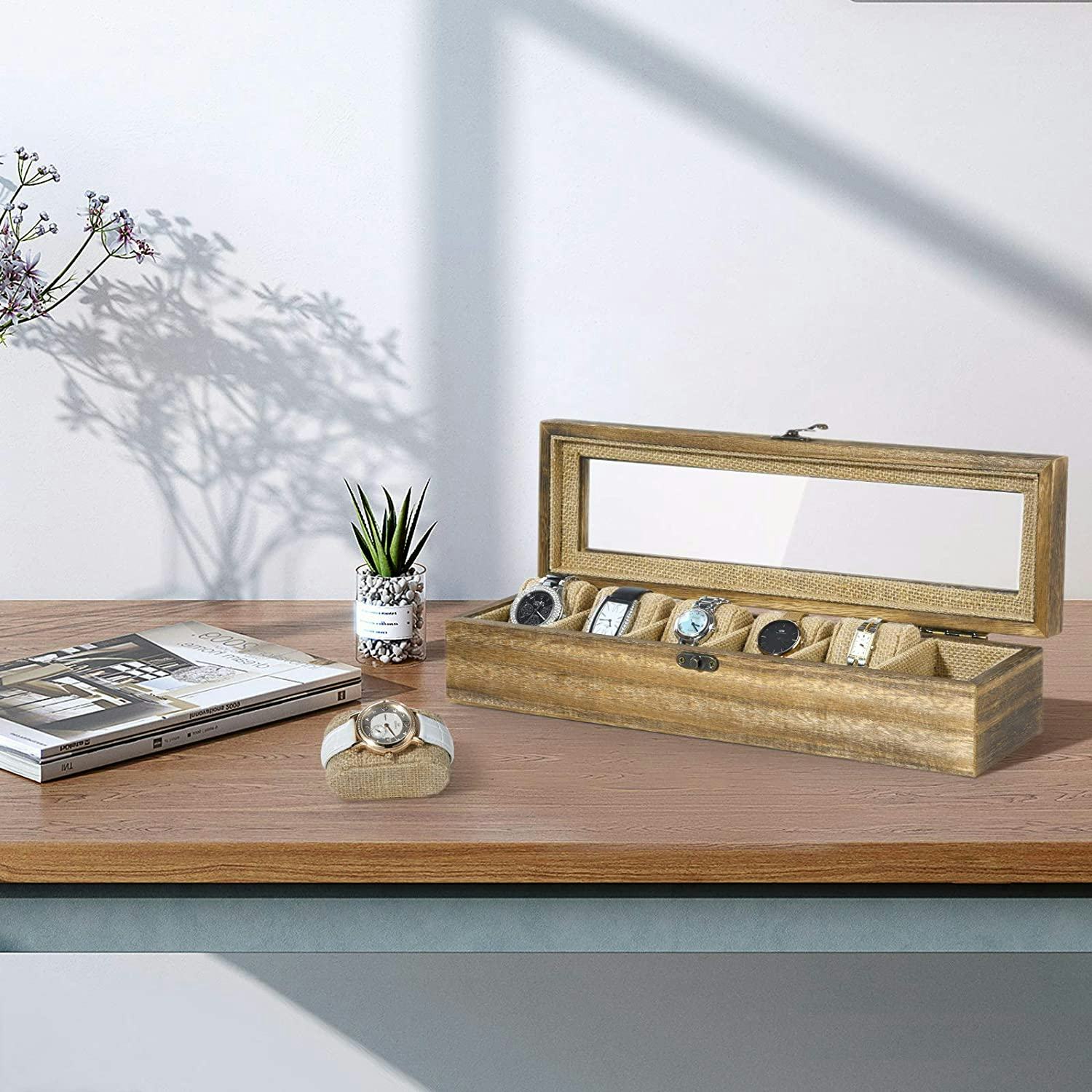 Keep your timepieces organized with this sophisticated watch box. Made from wood and glass with burlap cushioning on the interior, this case lets you display up to six of your favorite watches, even when you’re not wearing them, and keeps them protected from dust. Not a watch person? This also makes a great storage space for cufflinks, earrings, and other personal items.