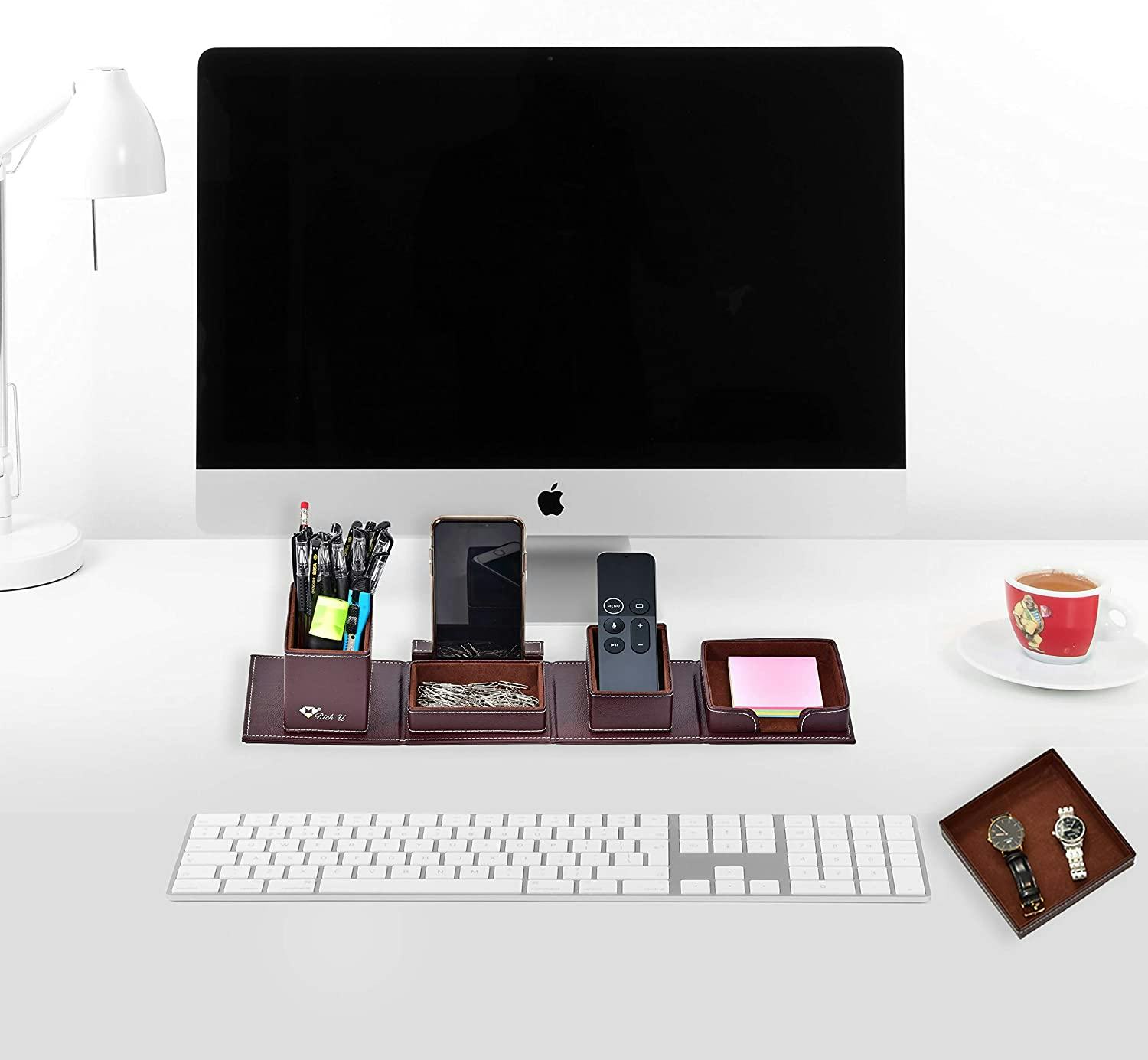 What’s scattered all over your desk? Pens, phone, notepads, glasses, keys? This set of attractive leather-wrapped desk organizers gives you a place to put everything. It includes holds for pens, notepads, and paperclips, and there’s even a slot that keeps your phone upright, so you can glance at the screen while working. It comes in brown and black color options.