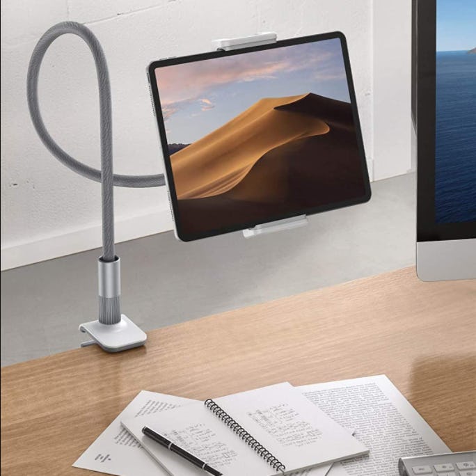 Clamp this clever tablet mount to a desk, bed frame, or counter and direct the long, sturdy gooseneck arm so the screen is precisely where you need it to watch a movie in bed, read music notation as you play, or follow a recipe. The gadget clamp part holds your phone or a large tablet and rotates for landscape or portrait viewing.