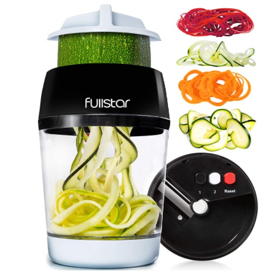 Turn your zucchini into noodles, your carrots into light salad elements, and onions into thin spirals in just a few minutes by inserting the vegetable into this manual spiralizer, choosing a thickness, and turning the handle. A hand guard keeps you from cutting yourself, the jar can be used for storage, and it all cleans up in the dishwasher.