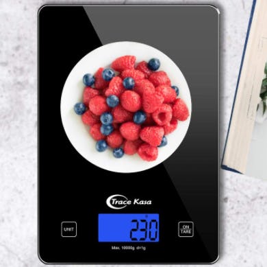 Fill the measuring cup and scoop with flour, sugar, water, or whatever you need to measure and lift it with the snap-on handle, which also happens to be a digital scale. You can see the weight of what you scooped right on the handle — in imperial or metric measure. It even converts five preset ingredients from ounces to cups.