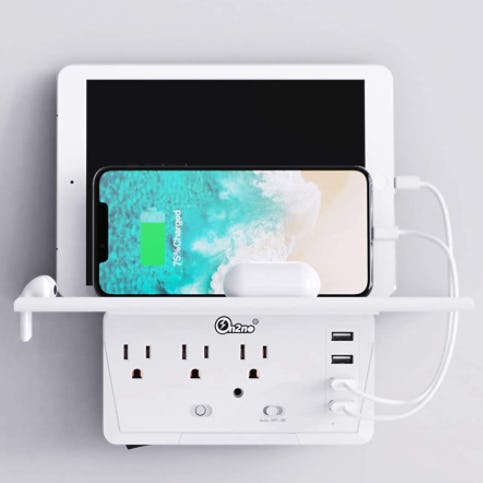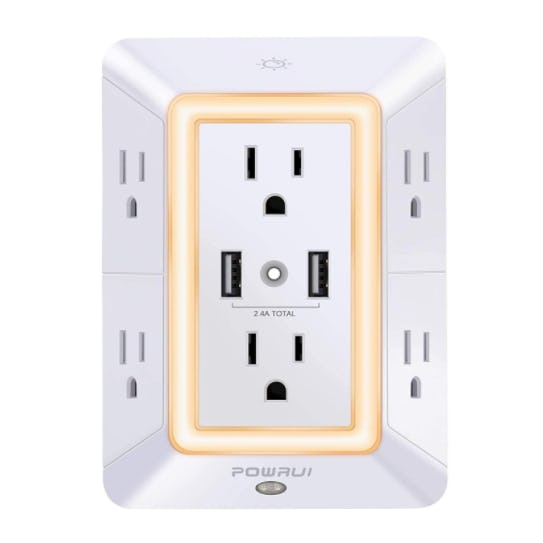 This outlet extender has everything you need to instantly transform a single outlet into a charging station and power hub. Plug it in and you have three standard outlets, four USB plugs, a night light that comes on when it’s dark, and a shelf — with cable channels — for your phone and other gadgets.