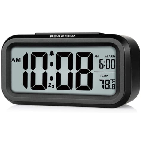This cute, easy-to-read alarm clock is perfect for a child’s room, a desk, or anywhere where you want to be able to glance at the time, easily set an alarm, see the letters at night — it shifts to backlighting when it’s dark — and know what the temperature is. A button on the top lets you snooze the alarm and it comes in five colors.