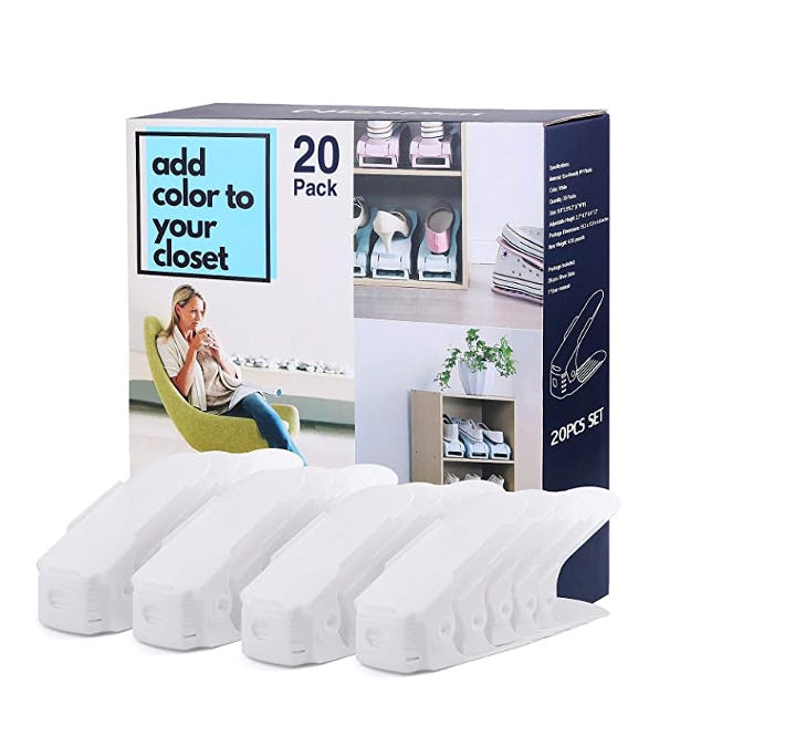 These store shoes one on top of the other so you can double your storage space and make room for, well, more shoes. Each shoe slot is adjustable from 2.7 to 7.2 inches, and these organizers accommodate all types of shoes, including men’s, women’s, and children's shoes. Raised flaps around the edges and bumps on the surface prevent shoes from sliding off, and the shoe slots clean up easily with soap and water.
