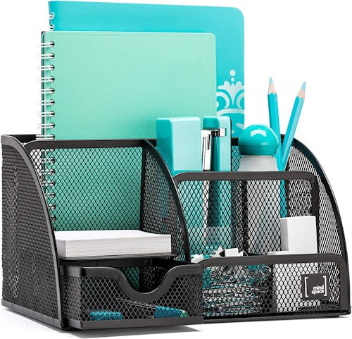 This clever office organizer sees that pile of stuff on your desk and raises it a place for everything, and everything in its place. The tall back section is an excellent nook for notebooks and mail, while office accessories of every style have a home in its five additional compartments of varying size.