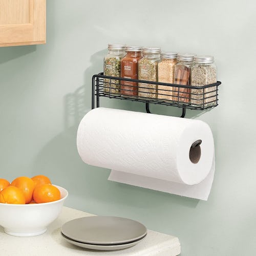 Ideal for the kitchen, laundry room, garage shop, or RV, this clever roll holder has a shelf up top for spice bottles, cleaning supplies, or small tools. Mounting hardware is included, and this efficient wonder is ready to go whether on walls, cabinets, or pantries. It has an open-arm design so spent rolls can be easily slipped off and replaced afresh.