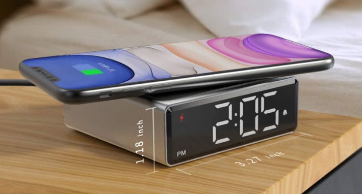 Declutter your nightstand with this digital alarm clock, which has a built-in wireless charger for your device. The charger is compatible with Qi-enabled phones and earbuds, and it’s case-friendly. What’s more, the alarm clock offers adjustable brightness settings, 12- and 24-hour time formats, and a snooze function. Choose from silver and black.